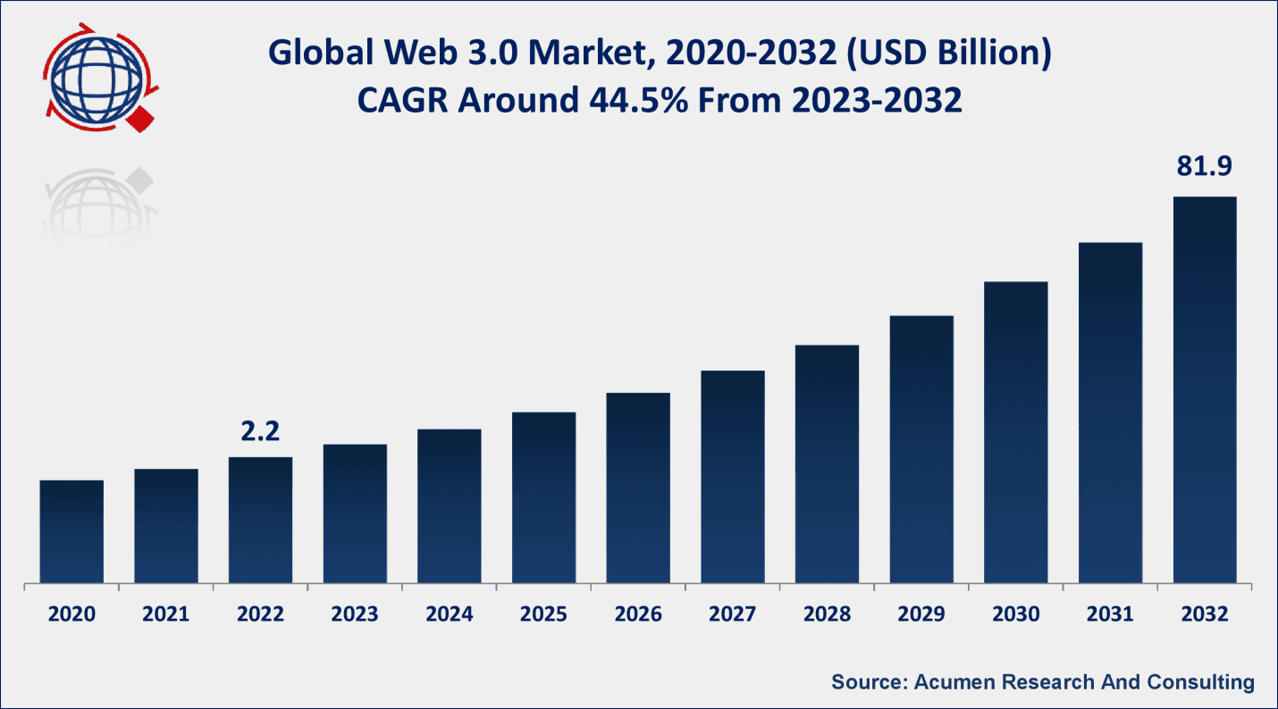 The Global Web 3.0 Market Size reached USD 2.2 Billion in 2022 and is projected to reach a market size of USD 81.9 Billion by end of 2032, growing at an impressive CAGR of 44.5% from 2023 to 2032.